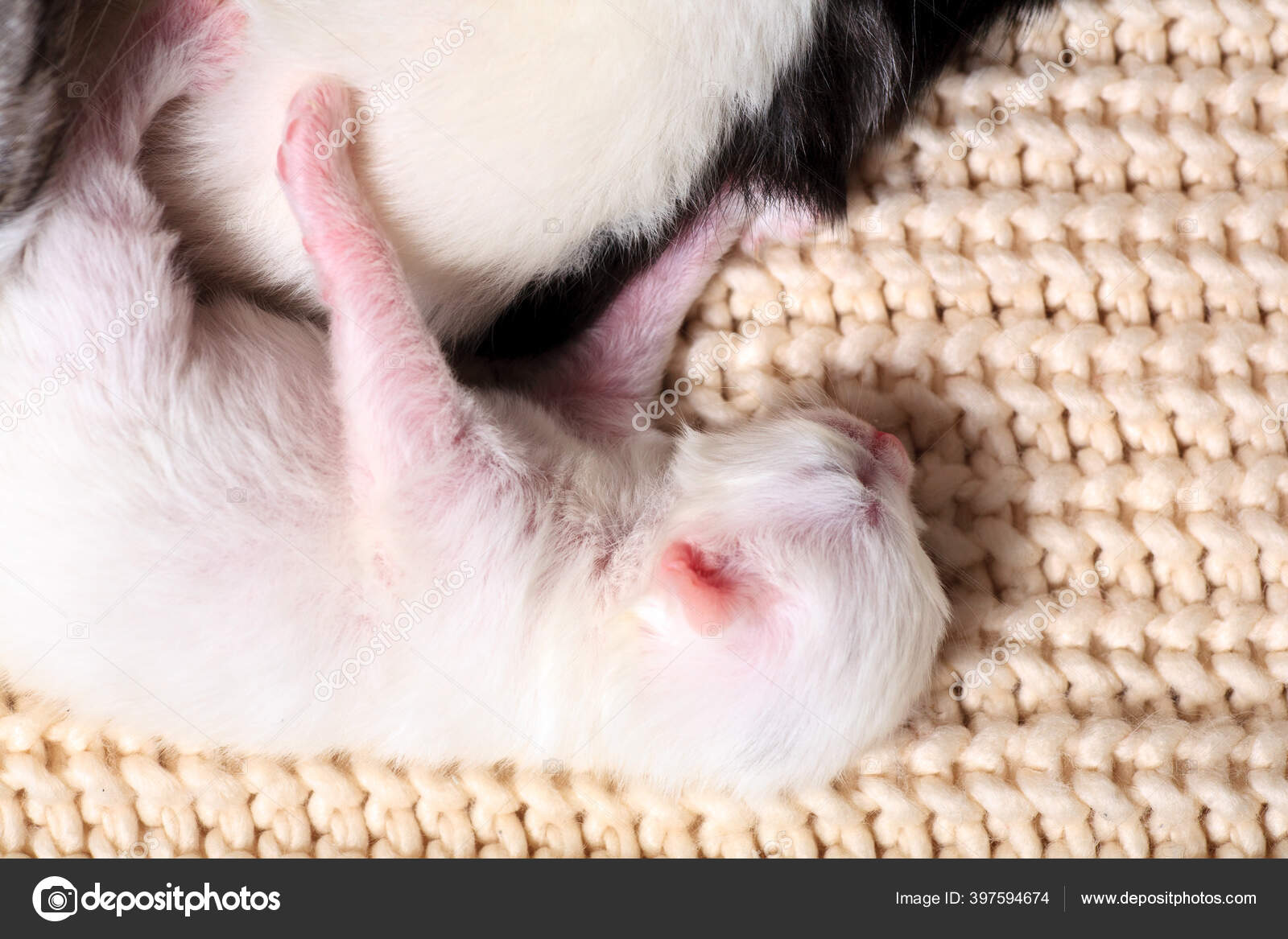 Nouveau Ne Petits Chatons Pour La Premiere Fois Sucer Un Lait De Chats Avec Les Yeux Fermes Les Petits Chatons Albinos Sont Completement Blancs Le Chat A Donne Naissance A Des Chatons Et